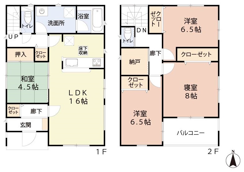 LDK16畳 1階 1室 和室4.5畳 1階 1室 洋室6.5畳 2階 2室 洋室8畳 2階 1室 S2畳 2階 1室 |